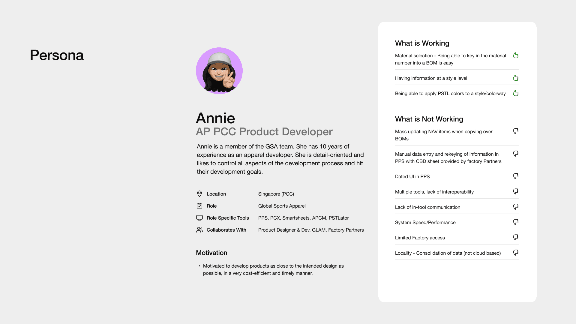Over a 2-week timeframe, we facilitated 10 1-hour user sessions with AP Product Developers across multiple segment and dimensions in the Asia PCCs to get a better understanding of PPS (Product Process system) and how they’re utilizing the platform.