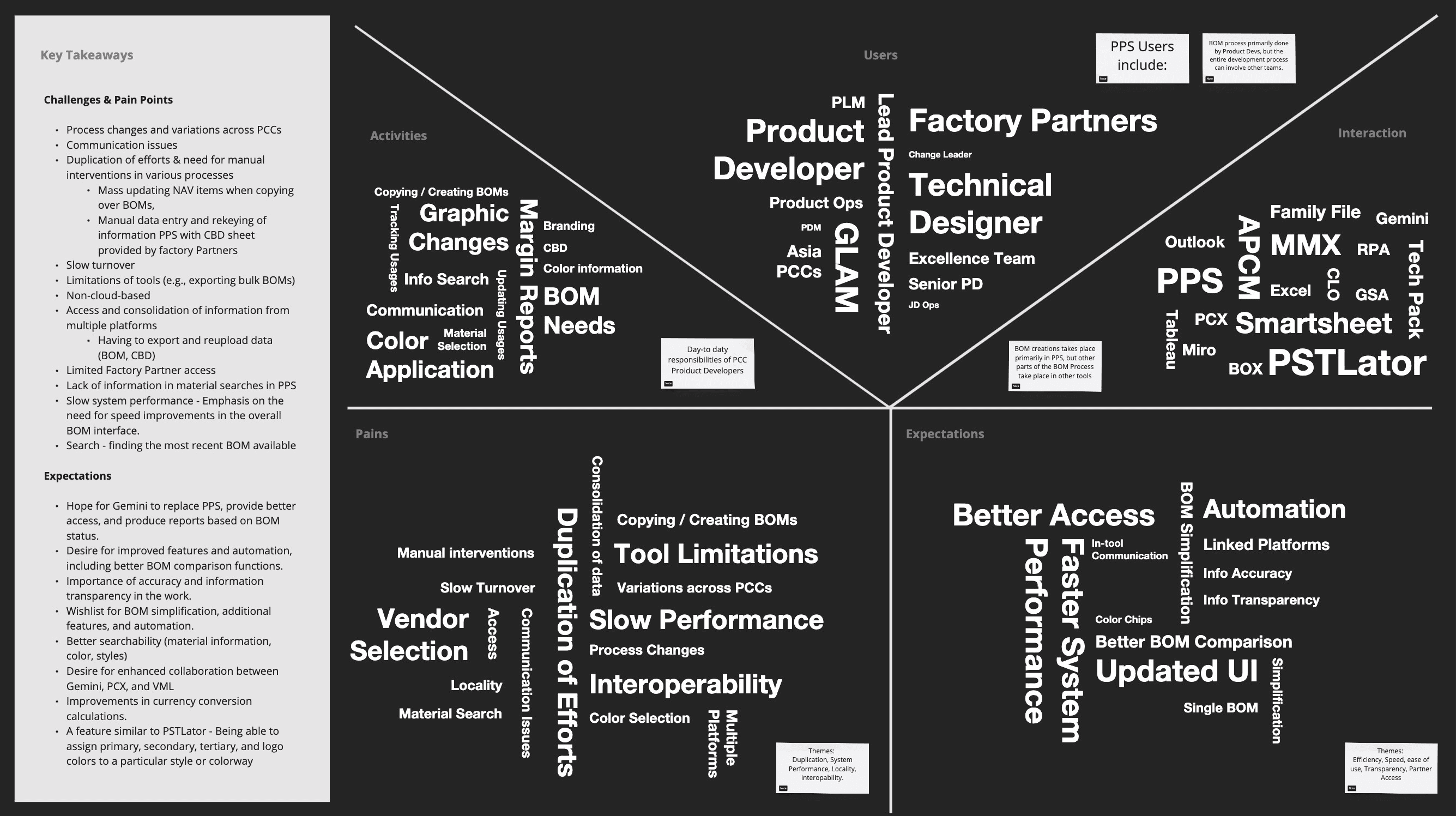 Users were frustrated by duplicated work, slow and outdated systems, reliance on local devices, and the need to jump between too many tools. These issues create inefficiency and friction across workflows. There’s a strong opportunity to streamline processes by eliminating unnecessary steps, improving system speed and usability, creating a more integrated experience, and making data more transparent and accessible. Providing permission-based, direct access for factory partners could further improve collaboration and efficiency.